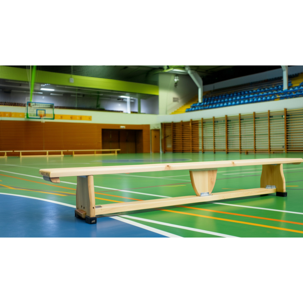 Скамья гимнастическая длиной 1,5 метра с деревянными ножками, предназначенная для использования в образовательных учреждениях и спортивных залах.
